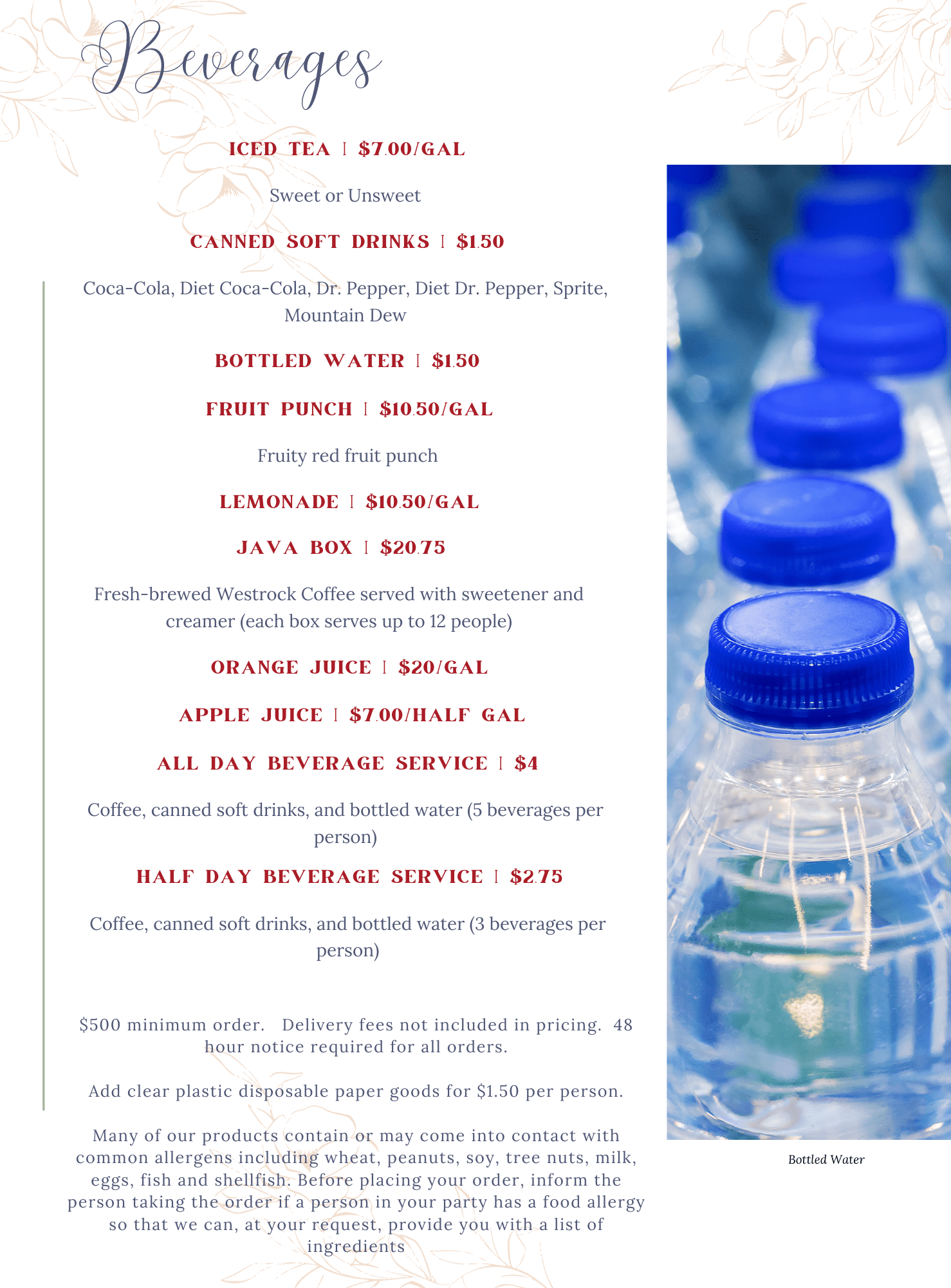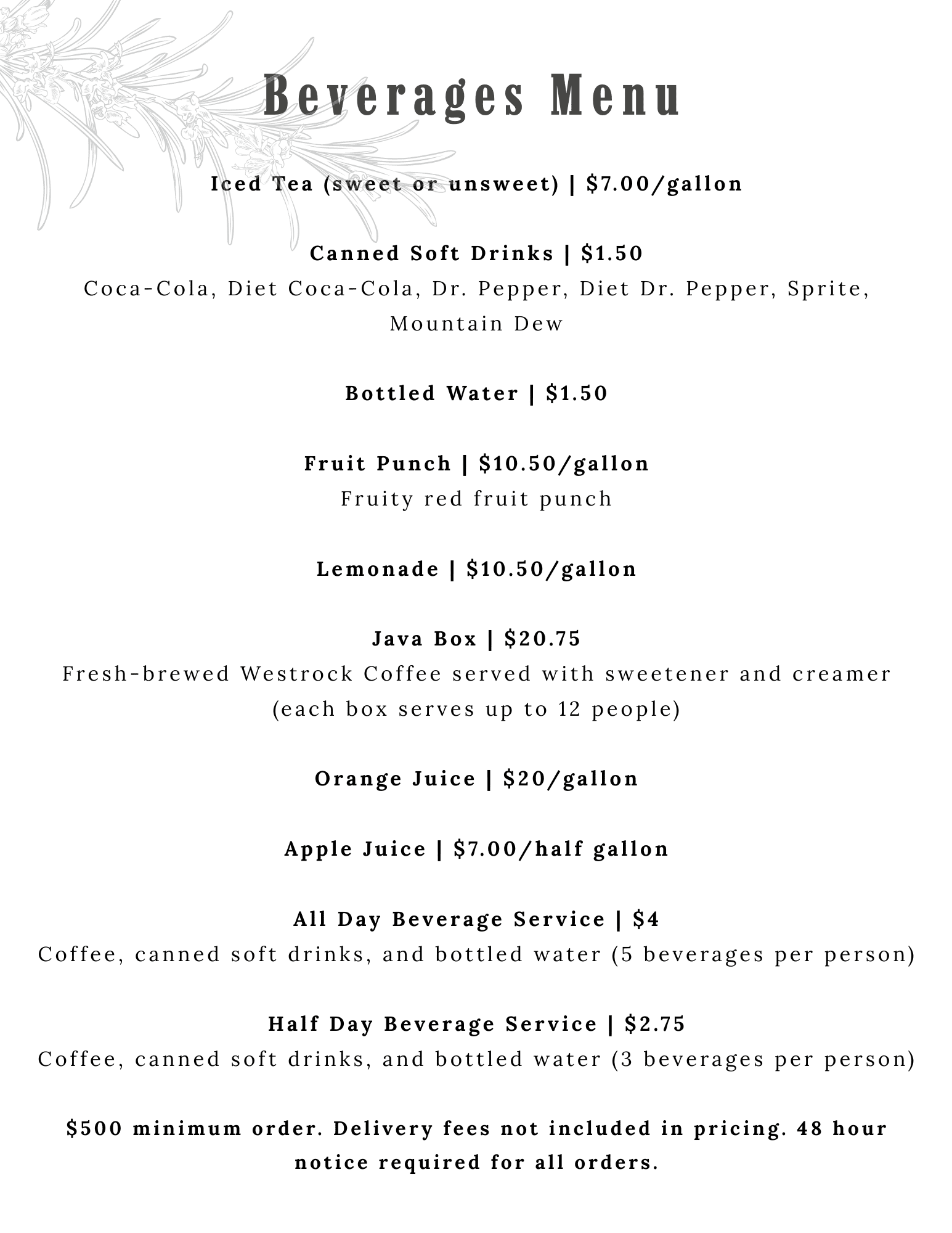 $500 minimum order. Delivery fees not included in pricing. 48 hour notice required for all orders.