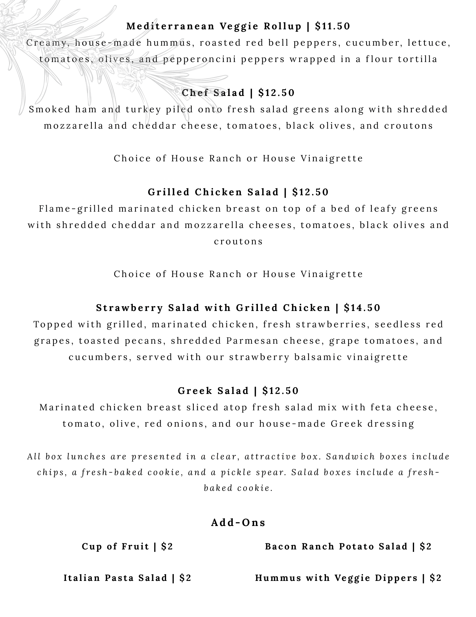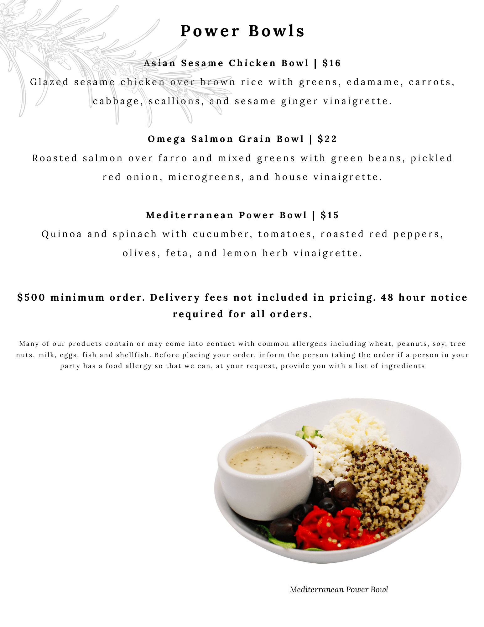 $500 minimum order. Delivery fees not included in pricing. 48 hour notice required for all orders.